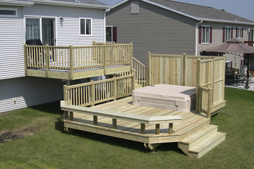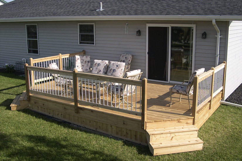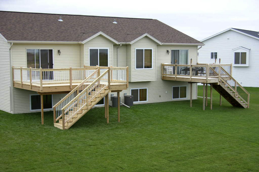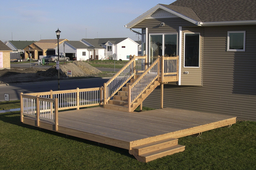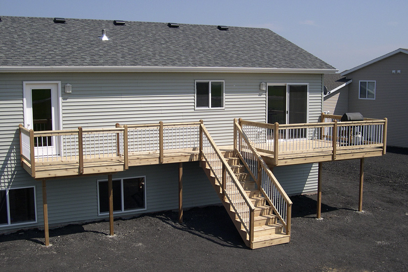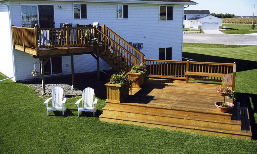 We use #1 Southern Yellow pine, pressure-treated lumber for the load-bearing structure of all of our decks. It boasts fewer and smaller knots than the #2 treated lumber that retailers in town typically stock (structural integrity is higher due to the fewer structural imperfections within the wood, i.e. knots). Using this product greatly reduces high and low spots in the flooring of decks, and it allows for excellent acceptance of chemical treatments that make it rot and insect resistant.